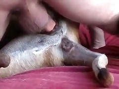 Стройный парень трахает собачью пизду на кровати